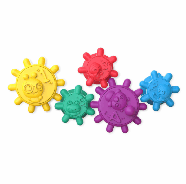 Un set extrem de distractiv si de stimulativ – Bebelusul poate cu usurinta sa sorteze, sa stivuiasca, sa invarta si sa lipeasca in diferite moduri cele 5 jucarii colorate, de dimensiuni si culori diferite