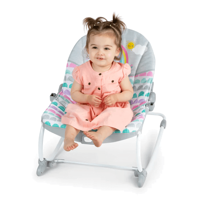 Viața alături de bebelusul tău este cât se poate de roz cu balansoarul Rosy Rainbow 2 în 1 de la Bright Starts.